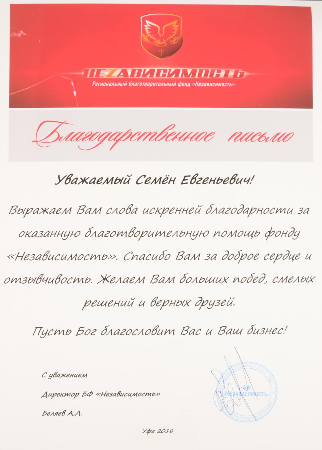 Благодарственное письмо - фонд Независимость