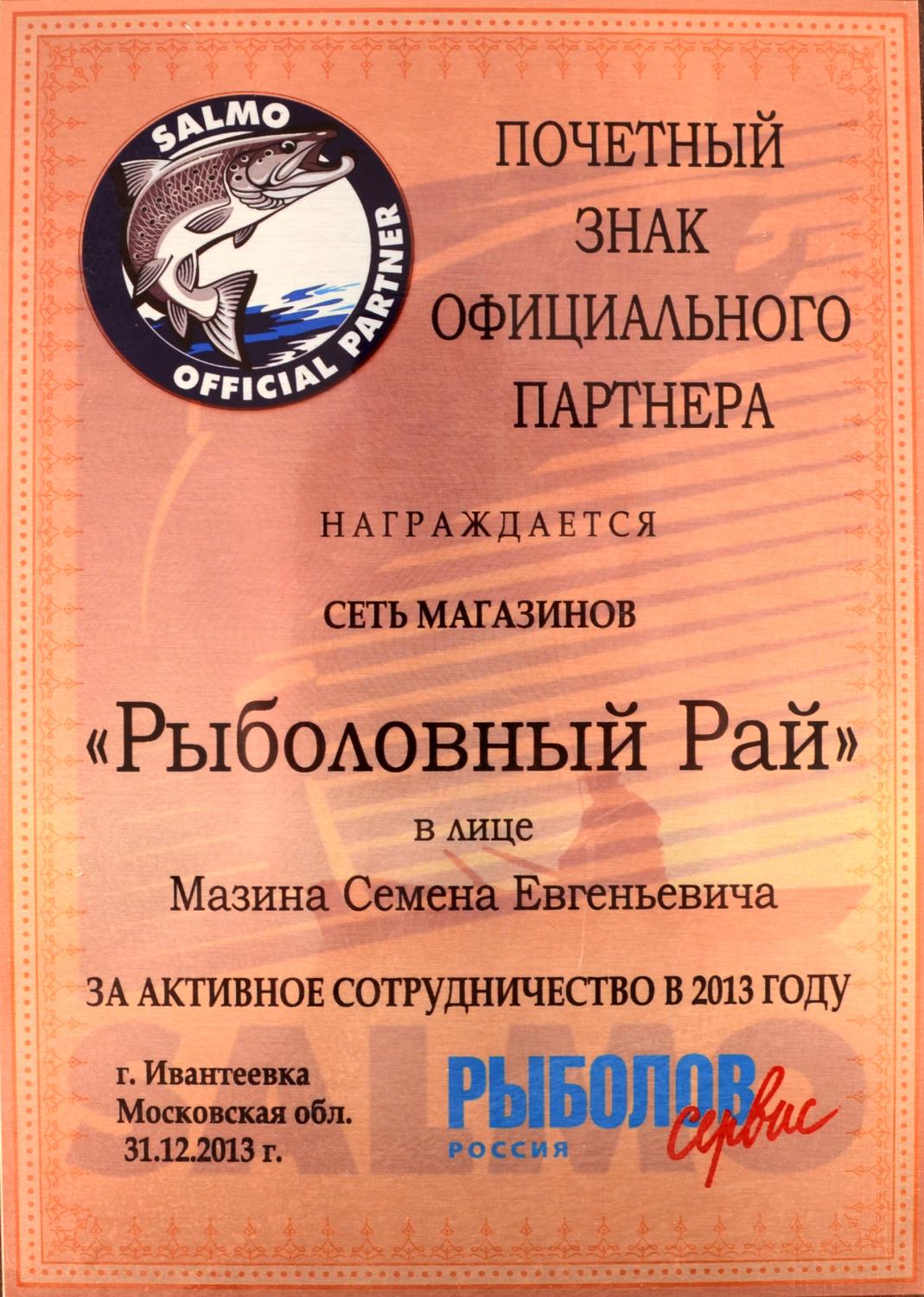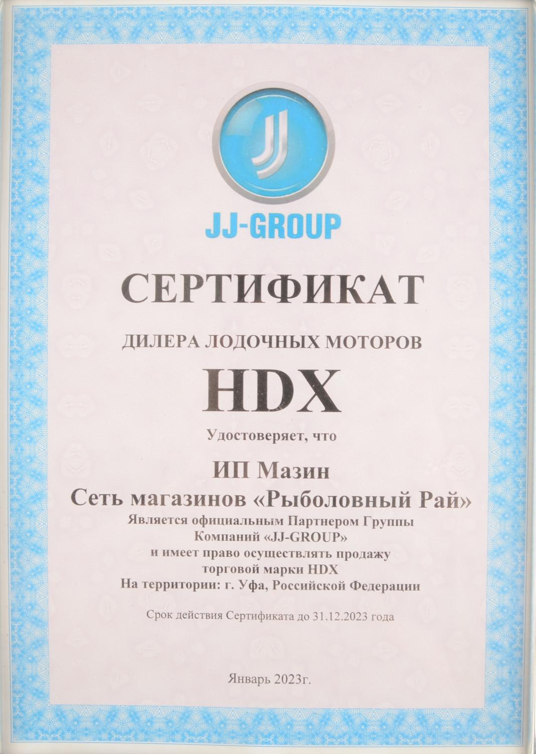 Сертификат - дилера лодочных моторов HDX