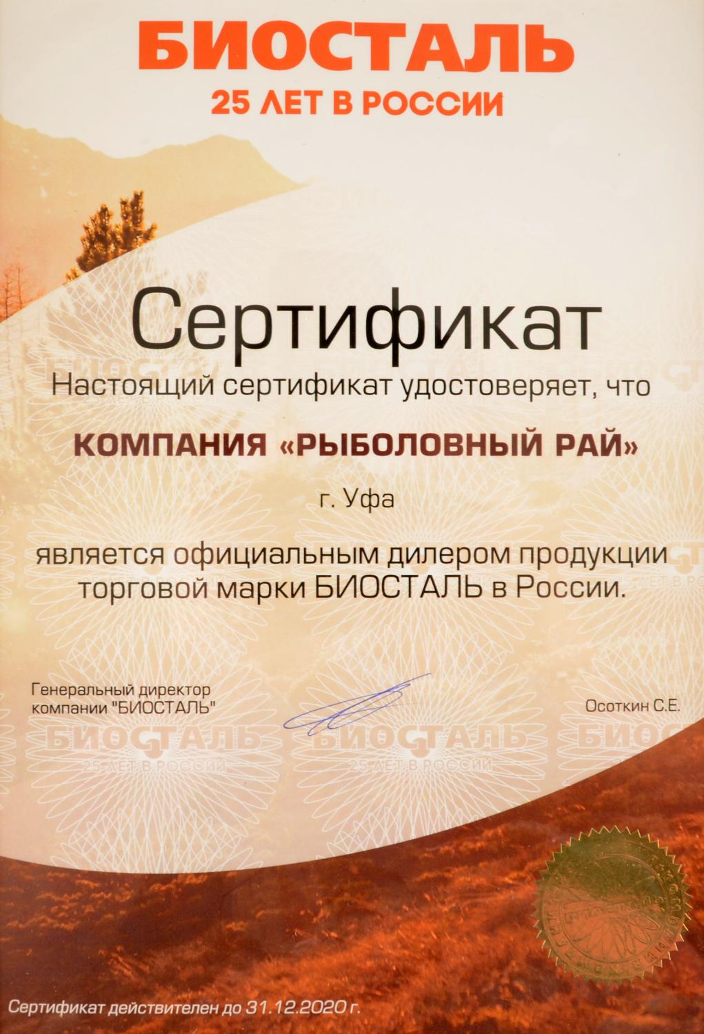 Сертификат - дилера Биосталь