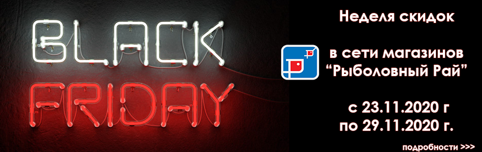 Акция действует во всех магазинах «Рыболовный Рай», в том числе и в интернет магазине www.Ribolov-ufa.ru (при условии заказа в период действия акции) с 23.11.2020г. с 10:00 по 29.11.2020 включительно. Другие действующие акции не отменяются, но и не суммируются с данной, также не суммируются скидки по дисконтным картам. На товары со спец ценой дополнительно скидки не распространяются. Количество товара ограничено складскими остатками.